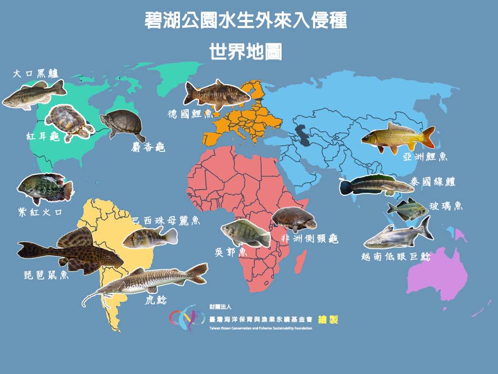 特別的是,海漁基金會在碧湖公園移除琵琶鼠魚過程中,也移除了高達21種外來種(附表一),包含原生於非洲的吳郭魚5,758尾、埃及鬍子鯰1尾、尖齒鬍鯰1尾、非洲側頸龜1尾;源自亞洲的玻璃魚21尾、金魚8尾、大頭鰱3尾、錦鯉3尾、朱文錦3尾、成吉思汗鯊2尾、泰國線鱧1尾、施氏魮1尾、烏魚1尾;美洲的火口魚88尾、大口黑鱸4尾、巴西珠母麗魚2尾、紫紅火口2尾、麝香龜2尾、虎鯰1尾;歐洲的大眼海鰱45尾、德國鯉魚1尾等來自世界五大洲的水生外來種。