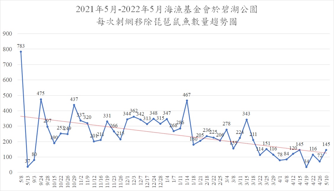 林愛龍進一步分析,碧湖公園初期每次中網的琵琶鼠魚數量達400多尾,後來在去年11月起有很長一段時間降至每次300多尾,到今年一月降至200多尾,三月氣溫回溫後卻更是降至100多尾,到四月份即使豔陽大熱天,卻開始不到100尾,由此可清楚掌握琵琶鼠魚數量不斷下滑,無論在寒冷的冬天或五月立夏回暖的天氣,琵琶鼠魚族群皆無回升現象,而來自五大洲的外來種則斷斷續續出現;許多釣客實際感覺到釣到琵琶鼠魚的機率大幅降低,當地民眾更是回饋基金會表示他們明顯感受到碧湖公園水質變好了、不再時常散發惡臭,這應屬琵琶鼠魚及外來種魚類數量降低、生物排泄量也隨之降低後的生態環境體質提升效果,這些辛苦的過程非常感謝台北市公園處的大力協助。而台北市碧湖公園的抑制琵琶鼠魚經驗非常值得作為台灣各地及世界各國在大自然水域移除外來入侵種的珍貴參考。